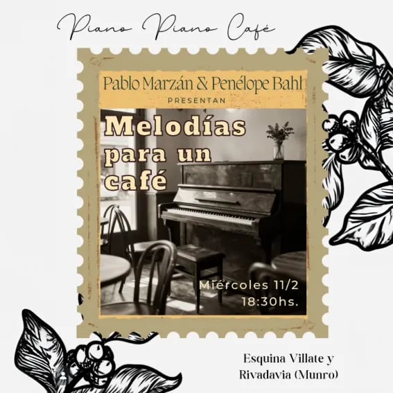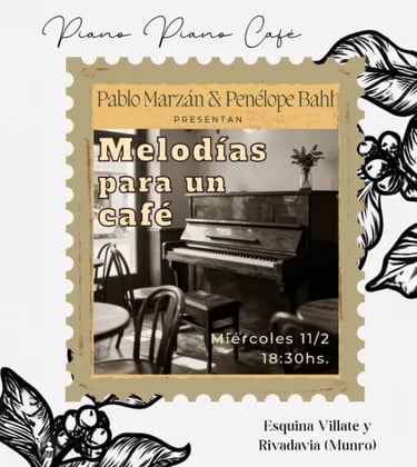 Este miércoles 11 de febrero a las 18:30hs., en el hermoso entorno de @cafe.piano.piano, podés venir a degustar cosas ricas y tomar el mejor café mientras escuchás a @pablomarzan (piano) y @penelopebahlstach (voz) interpretando las más bonitas melodías en un show acústico e íntimo.
